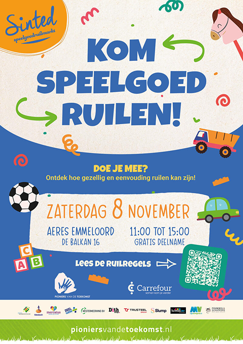 Op zaterdag 8 november van 11.00 tot 15.00 uur verandert de hal van Aeres in Emmeloord in een vrolijke speelgoedschatkamer. Samen met Carrefour organiseert de evenementencommissie van stichting Pioniers van de Toekomst een speelgoedruilmarkt waar kinderen en ouders nieuw speelplezier ontdekken, zonder dat er iets nieuws gekocht hoeft te worden.